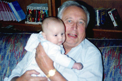 | Joe looks proud, but a little fearful, while holding his brand-new, first grandson, David. |