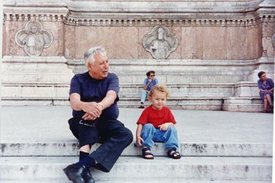 | Baby-sitting with David in Bologna, Italy, during a heat-wave there. One of the coolest places was the Cathedral--or its steps. |